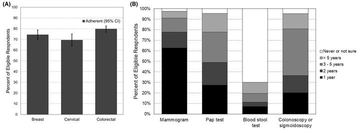 Adherence to cancer screening is important for cancer survivors because they are at high risk of subsequent cancer diagnoses or recurrence. We assessed adherence to breast, cervical, and colorectal cancer-(CRC)-screening guidelines and evaluated demographic disparities among a population-based sample of survivors. A representative sample of Utah survivors diagnosed from 2012–2018 with any reportable invasive cancer was selected from central cancer registry records for a survey about survivorship needs. We estimated the proportion of eligible survivors adhering to U.S. Preventive Services Task Force screening guidelines and calculated risk ratios and 95% confidence intervals. Analyses were age-adjusted and weighted to account for sample design and nonresponse. And 1421 survivors completed the survey (57.2% response rate). Screening adherence was 74.4% for breast, 69.4% for cervical, and 79.7% for CRC. Rural residents were more likely to adhere to breast cancer screening than urban residents (86.1% vs. 72.7%; adjusted RR = 1.19, CI = 1.05, 1.36). Higher educational attainment was associated with increased adherence to cervical and colorectal cancer screening. Younger age was associated with greater adherence to cervical cancer screening (p = 0.006) but lower adherence to CRC screening (p = 0.003). CRC screening adherence was lower among the uninsured and those without a primary care provider (45.6%) compared to those with a regular provider (83.0%; adjusted RR = 0.57, CI = 0.42, 0.79). Surveys based on samples from central cancer registries can provide population estimates to inform cancer control. Findings demonstrate work is needed to ensure all Utah cancer survivors obtain recommended cancer screenings. Efforts should focus particularly on increasing uptake of breast and cervical cancer screening and reducing demographic disparities in CRC screening.